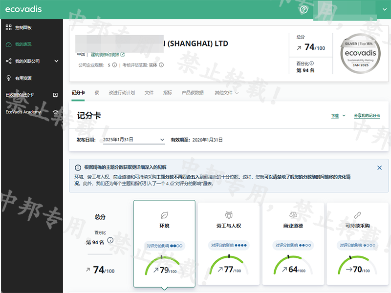 恭贺XX建设工程(上海)有限公司2025年1月顺利通过EcoVadis验厂 获得74分金牌!
